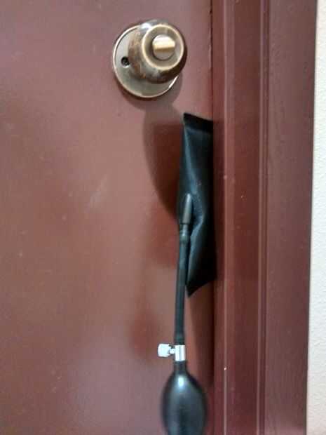 Por lo tanto, empezar por desinflar la cuña de aire. Ahora, toma tu cuña achatada y deslícelo en la ranura en la puerta. Usted desea que estar tan cerca el cierre como sea posible y con la puerta como centrado posible en la cuña.