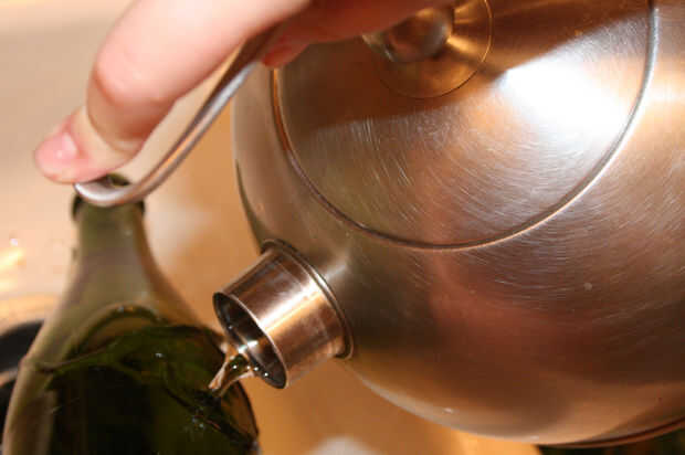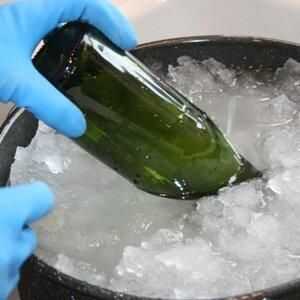 2. ahora rápidamente sumerja calentado, marcó el final de la botella en un baño de agua helada. Las moléculas excitadas en el vidrio ahora se contraerá rápidamente. Escuchará un leve estallido del vidrio si está listo para separarse. A veces tienes que recalentar el vidrio otra vez con el agua hervida y volver a sumergir el cristal en el baño de hielo. Generalmente se separará el vidrio sin presión. Pero a veces usted encontrará que ligera presión con una mano enguantada le ayudar en el proceso.