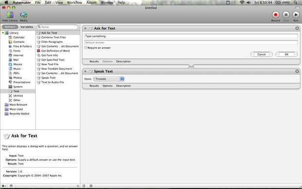 Decir te permite obtener la acción de "Preguntar para texto" primero en su flujo de trabajo. Esta acción abrirá una pequeña ventana y pedirle que escriba algo. Todo lo que escribes se pasará la siguiente acción. Digamos que su próxima acción es hablar texto. Esto leerá el texto de la acción anterior (consultar texto) y hablar a través de los altavoces.