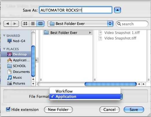 La otra opción es guardar el flujo de trabajo como una aplicación. Para ello, haga clic en guardar desde el menú archivo. En la pestaña de formato de archivo, seleccione aplicación. Un archivo guardado como una aplicación es un móvil ejecutar botón en el finder.