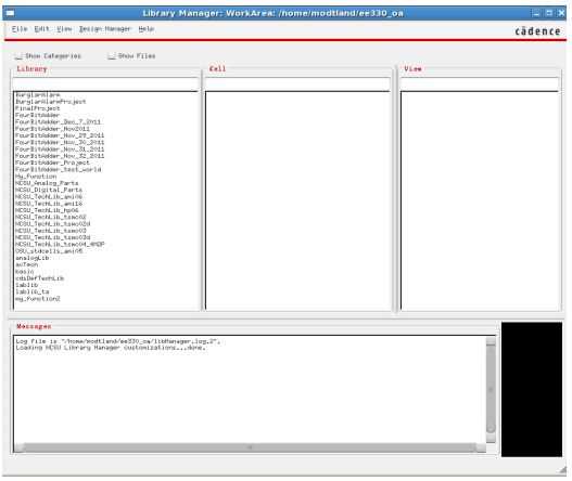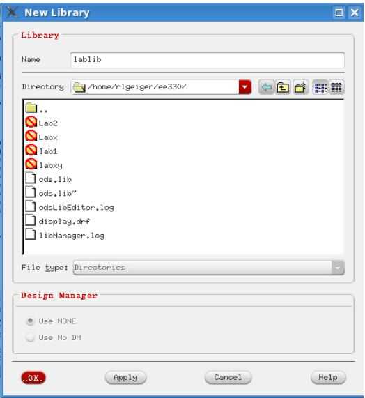 Software de virtuoso y abrirlo, aparece una ventana de administrador de la biblioteca (Figura 1). Haga clic en File→New→Library. En el formulario que aparece, se muestra en la Fig.2, escriba el nombre la biblioteca < inversor > en el campo Nombre y haga clic en Aceptar.