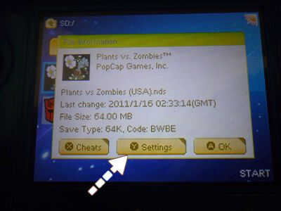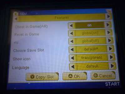 Encender su consola 3ds y haga clic en la r4i gold 3ds icono → haga clic en resaltado → "Tarjeta MicroSD" el juego que desea jugar → haga clic en "Inicio" → haga clic en "configuración de"→"información de archivo" → "características" → Activar trucos en el juego (AR) →save la configuración