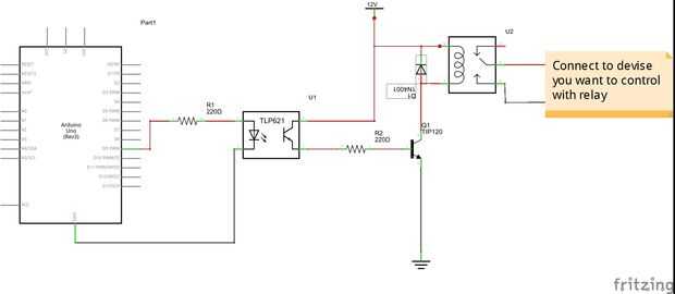 Ahora para el Relais estoy usando un relé de 12v, si usas un repetidor que requiere un voltaje diferente utilice la fuente de alimentación apropiada. También recuerda no conectar sus terrenos entre su arduino y fuente de alimentación, por eso estamos utilizando el optoacoplador para aislar unos de otros.