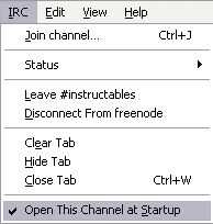 Una vez en Chatzilla, entonces usted puede ir a IRC > canal esta abierto en el inicio. Al seleccionar esta opción, Chatzilla se conectará automáticamente a Freenode y #Instructables cada vez que lo abra.