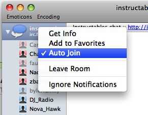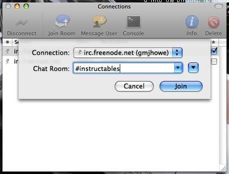 Asegúrese de seleccionar la recién hecha ' irc.freenode.net (su_nombre_de_usuario) conexión, entrar en ' #instructables ' para el nombre de la sala de chat. Los usuarios de Mac pueden entrar un #(símbolo hash) presionando 'Alt + 3'.