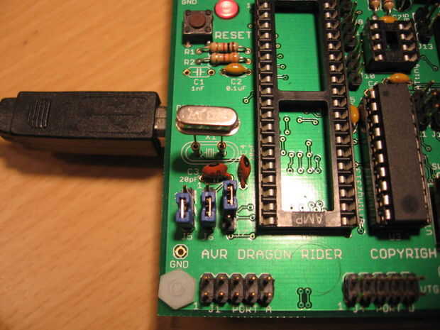 La Dragon Rider 500 tiene zócalos para Microcontroladores AVR de tamaño diferentes varios. Estos incluyen: 8, 20, 28 y 40 casquillos de perno. Dependiendo de que enchufe usa, jumpers en la placa de Dragon Rider deben definirse diferentemente.