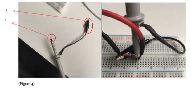 3 Conecte la pin(1) de la sonda hacia el lado positivo de la resistencia (o cualquier componente que te piden para medir). Luego conecte la ground(2) de la sonda a la tierra común en su circuito. (Figura 4)