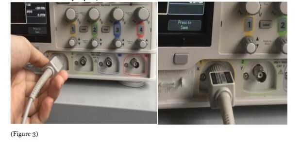 2 Conecte la punta de prueba con el canal de entrada del osciloscopio 1 (gire levemente la articulación hasta que perfectamente se conecta con el puerto de entrada). (Figura 3)