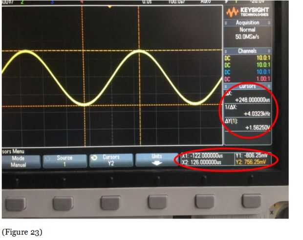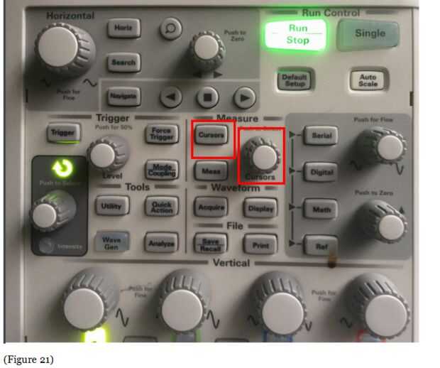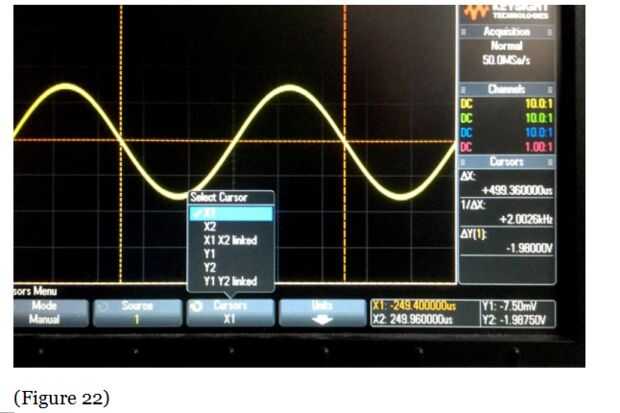 3 en el área de la función, busque el botón rotativo de "Cursores". Girando el botón de que son capaces de ver una línea vertical de puntos en pantalla. Elige un punto en su onda de la señal y "X 1" línea para alcanzarla. Ahora se puede ver el tiempo en ese punto (Figura 21)