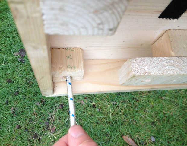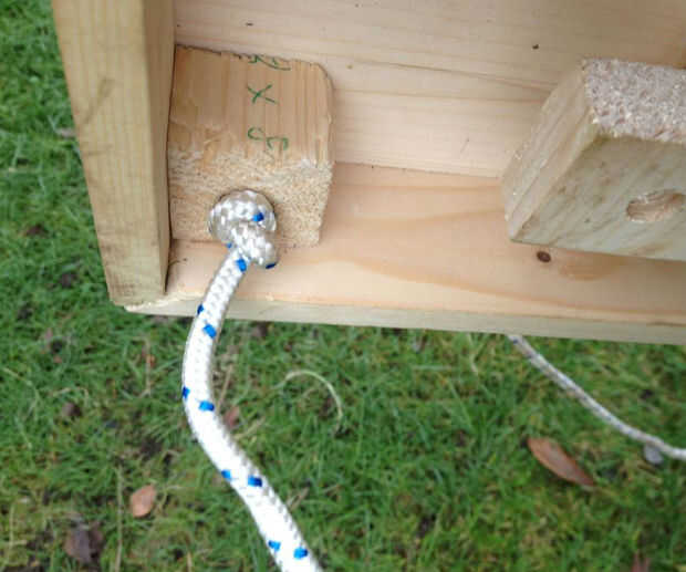 Primero tire de la cuerda por el agujero de 1 centímetro, ahora tira de la cuerda hasta el columpio está colgando en la altura correcta. También asegúrese de que el swing está colgando bien horizontalmente. En la parte inferior de la mecedora donde la cuerda entra por el agujero de 1 centímetro se fija la cuerda con una puntada de carpintero.