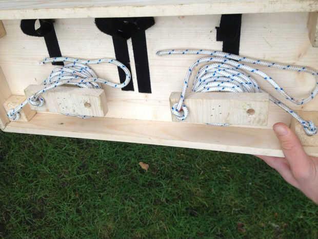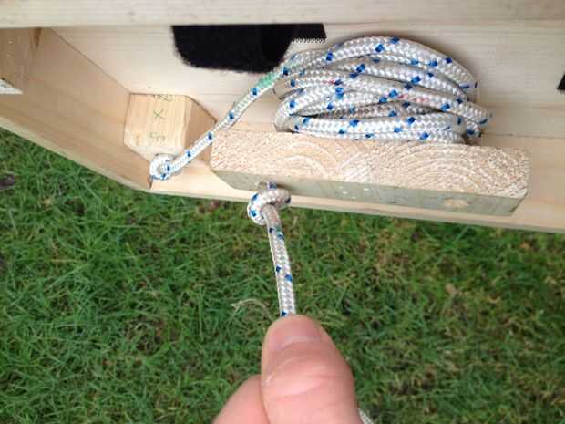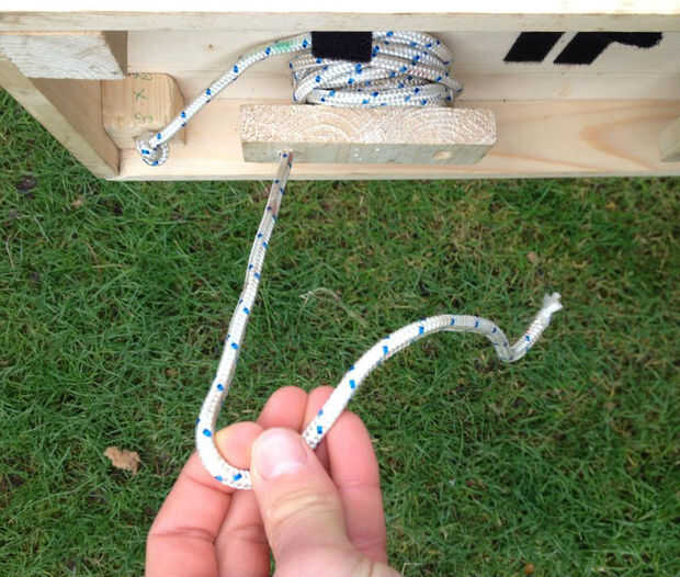 Ahora gire el excedente de la cuerda alrededor de los cubos de madera. Cuando tienes sobre cuerda de 30 centímetros sobre ti Coloque la cuerda a través de uno de los dos agujeros y fijar con un stich de carpintero. Hacer esto con ambas cuerdas.