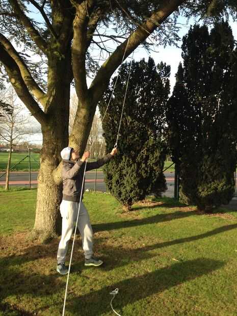 Tomar la cuerda alrededor de 1 metro de la presión y y oscilación sobre la rama del árbol elegido. Hacer esto con dos ganchos.