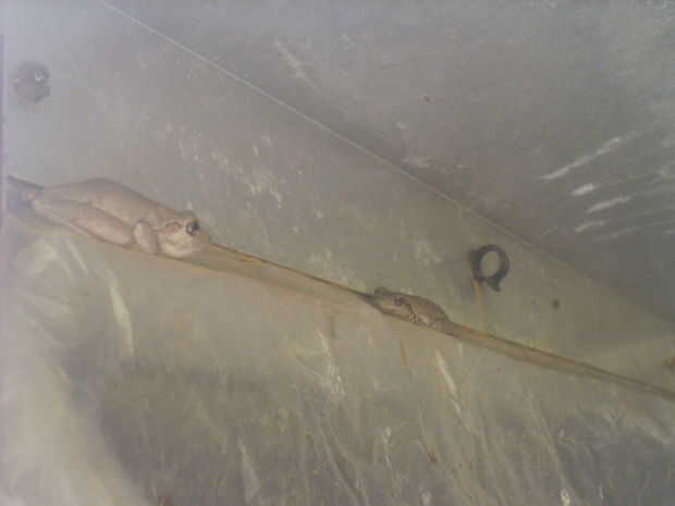 Yo debo han mencionado que el refrigerador de aire se ha convertido en un hábitat de la rana. Siete vivían en él en el último recuento. Cualquier puerto en una sequía eh.