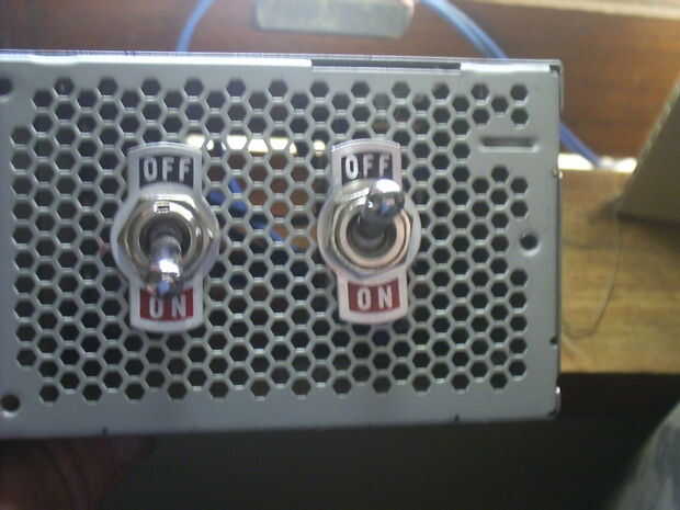 Construido una caja de interruptor de un viejo caso de fuente de poder pc, agregué 2 automotores interruptores y fusibles 2 x 10 amp y funcionó los cables de la bomba y el ventilador por que a la salida de la carga en mi regulador solar.