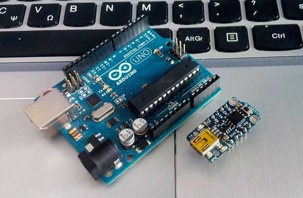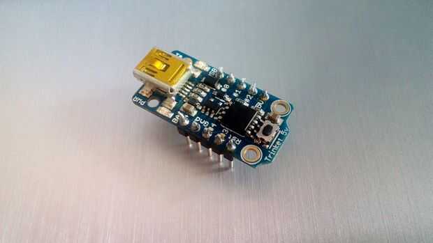 Esta pequeña tabla es utilizando el microcontrolador ATtiny85 y tiene 8K de memoria flash, 5 pins de I/O (incluyendo entradas analógicas y salidas PWM) y una conexión USB (mini-USB). Puede batería accionada arriba por cable usb o externa.