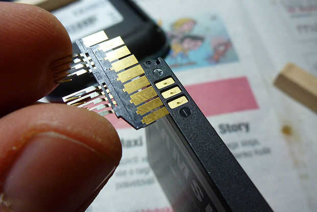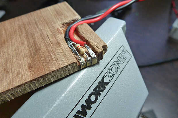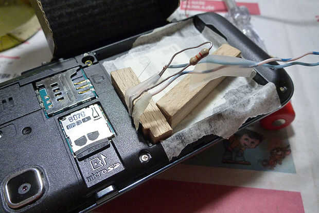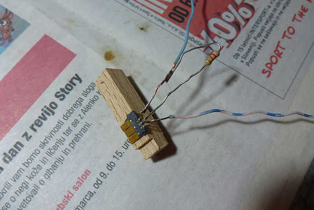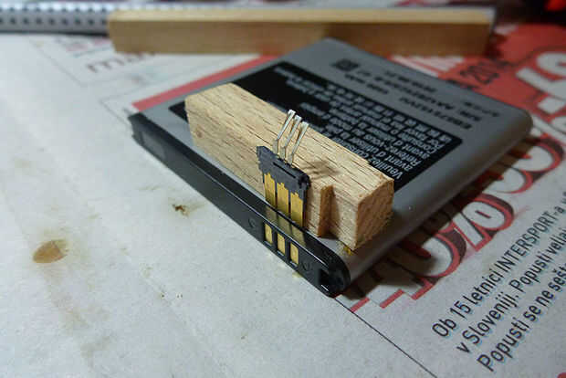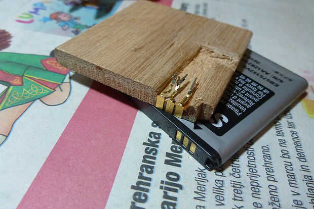 Yo tomé pernos del adaptador de tarjeta SD y pegamento con Super Attak pegamento en el pedazo de madera.