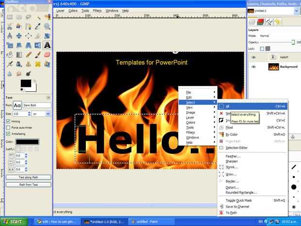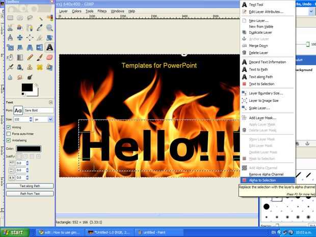 2. en el panel que tengo en el lado derecho de mi pantalla, derecha haga clic en la capa que tiene lo que ha escrito (no las llamas). Después clic derecho clic alfa a selección.
