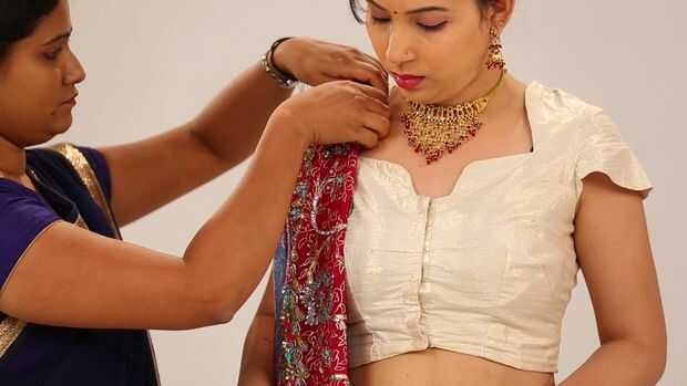 Cómo ponerse un sari de fiesta estilo-Utilizar una gasa o del georgette sari mitad y mitad, para este método. Meta el extremo de la sari (no pallu final) en el lado derecho y llevarlo alrededor de la cintura a la parte posterior, tuck completamente m