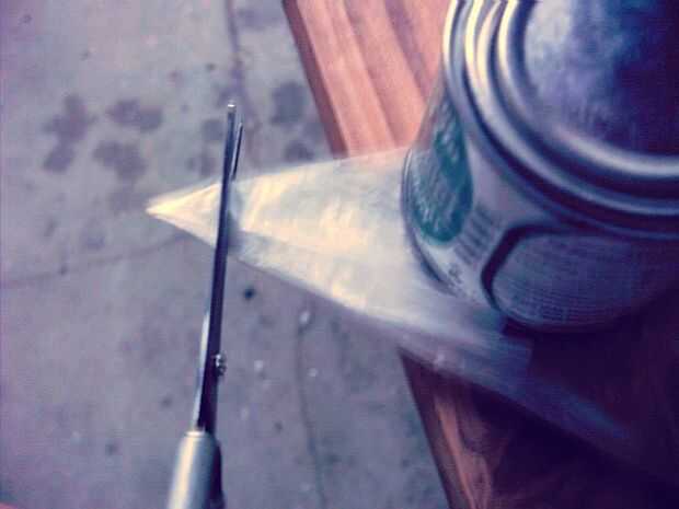 2) para cubrir con una lámina de plástico en la boca de la lata, dejando un agujero central para sacar el pegamento.