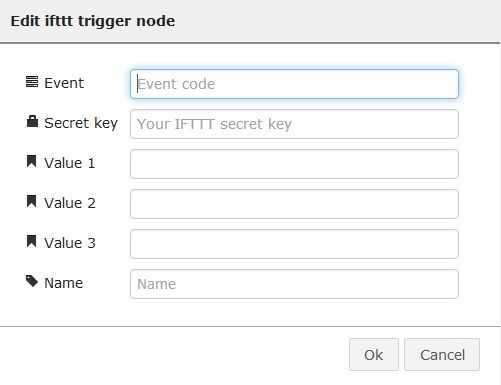 Haciendo doble clic en el nodo de Trigger de IFTTT, usted verá el panel de configuración como en la foto.