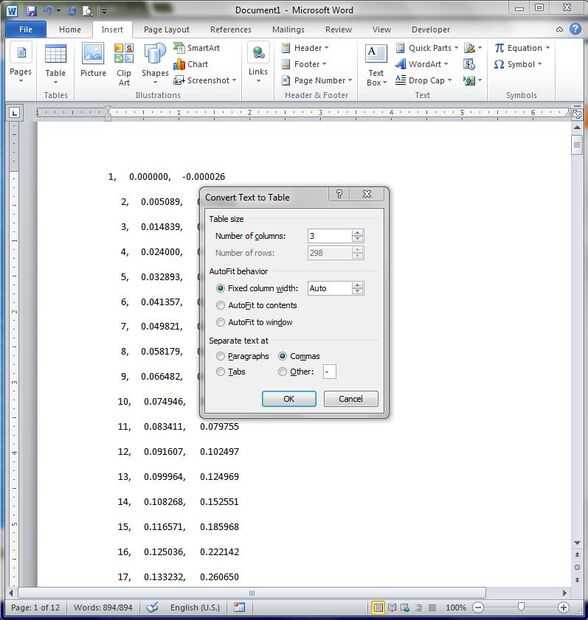 Después de texto al convertidor de la tabla está abierto, se abrirá un menú. Este menú puede verse en la foto de arriba. Lo importante a destacar es el número de columnas que desea y la sección inferior, que identifica en la tabla inserta líneas. Los datos de la muestra es claramente separados por comas, por lo que la palabra había seleccionada comas como separadores de tabla. Sin embargo, puede seleccionar personalizado se rompe mediante el uso de la 'otra' selección. Por ejemplo, si sus datos es separados por espacios de seis y sin coma, escribiendo "" (golpear la barra espaciadora seis veces) en la otra caja se separarán los datos cada vez que ve a seis espacios. Una vez que las opciones son correctas, golpe OK y va a cambiar sus datos.