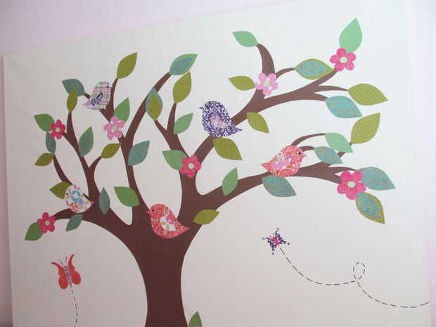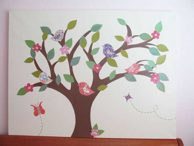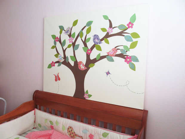 hice esto para decorar la habitación de mi próximo bebé de la muchacha. Todo (aves, hojas, flores y árboles), corte de papel de desecho de reserva entonces mod podged a la lona. Para el árbol he seguido la forma básica de una etiqueta de la pared que vi en línea. Encontré que era más fácil dibujar las ramas si he usado mi codo como punto de pivote. Para hacer un poco más personalizada he añadido un par mariposas usando las mismas formas de los colgantes de mariposa que he hecho.