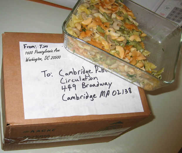 A en coche de Boston a Florida sin caer dormido y morir, revisé cinco galones de libros en cinta de la biblioteca pública de Cambridge para escuchar en el camino. Cuando llegué vivo y había acabado de las cintas, las pongo en este cuadro de regreso por correo. Mi hermana no tenía ninguÌ n pegamento para poner la etiqueta de dirección, pero mi cuñado sólo había cocinado por un lote promedio de pasta. Yo puré hasta un par de fideos para usar como pegamento, y efectivamente, funcionaba como un encanto.