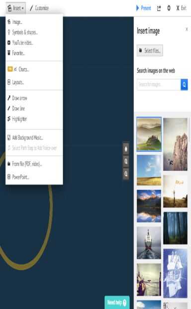 Para complementar el texto, usted puede agregar fotos o incluso vídeos, para ello, simplemente haga clic en "Insertar" en la parte superior de la página. Aparece un menú desplegable que te permitirá añadir una imagen, YouTube video, una flecha y mucho más. Añadir un foto haz click en "imagen" en el desplegable del menú y un lado aparecerán con imágenes previamente cargados; puede seleccionar una de sus imágenes o añadir sus propia haciendo clic en el botón "Select archivos" y buscar el ordenador archivos de la imagen deseada. Añadir tu imagen a un marco haciendo clic y arrastrando en su marco de elección.