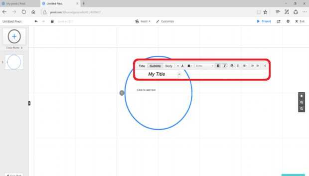 Una vez usted haga clic en el botón "Iniciar un Prezi en blanco" el indicador desaparecerá y usted podrá ver su "lienzo". Usted verá un círculo grande con dos etiquetas de lectura "Haga clic para agregar texto"; el círculo se llama un marco y son equivalentes a "diapositivas" en el software tradicional de presentación como PowerPoint. Para comenzar a crear la presentación, haga clic en el campo que dice "Haga clic para agregar texto" en negrita para dar su primer marco de un título. Una vez que el cursor se encuentra en ese campo de texto, aparecerá una pequeña barra de herramientas flotante sobre el cursor que permite modificar la configuración de la fuente, cosas tales como: tipo de letra; opción de fuente (negrita, cursiva, subrayado); color del texto; espaciamiento; sangría y viñetas, en caso que desee cambiar el formato de tu texto.