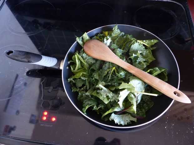 El resto, salteado junto con algunos jardín col rizada y acelgas con un poco de ajo (Foto 1). Lo hice a finales de los 20 minutos para que todo sea caliente una vez que las remolachas enteras fueron acabadas de cocina. También he añadido un tomate en la mezcla.