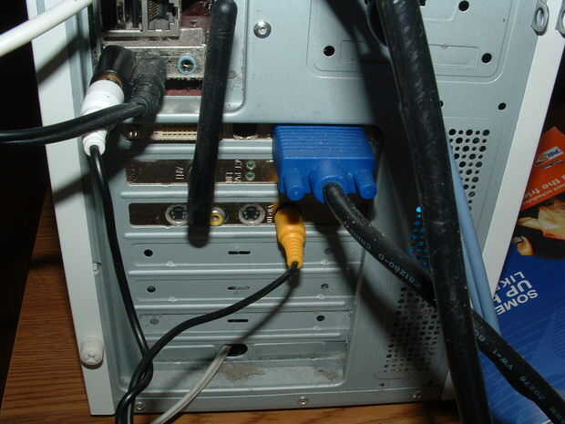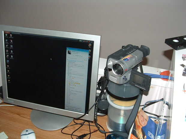 Configuración de la videocámara en algún lugar dentro del alcance de los cables de la computadora y conecte en su tarjeta edición de vídeo (mina es un antiguo DC Pinnacle-10 + que he tenido durante años) o su tarjeta de sintonizador de TV.