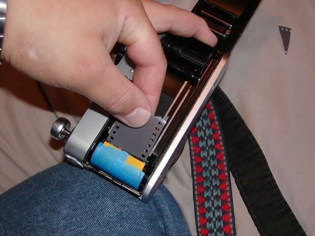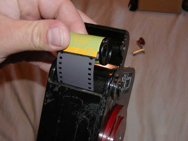 Ahora usted puede cargar el cartucho en su cámara favorita o ponerlas en latas de película para el almacenamiento. La razón que corta el extremo de la película en un ángulo para que la película podría ser insertada en la ranura de la bobina de avance de película en la cámara como se muestra, puede que tenga que experimentar en cómo usted corte el extremo así que mejor cabe la tome el carrete en la cámara.