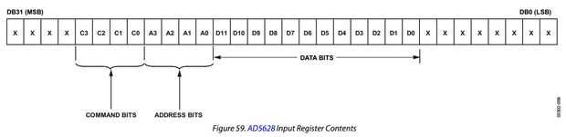 Si nos fijamos en la hoja de datos para el chip en las páginas 21 y 22, podemos ver que en nuestra comunicación con el chip que acabaremos enviando una serie de bits de "comando" para saber el chip lo que pretendemos hacer así como una serie de bits de dirección para indicar que queremos que nuestra señal analógica para aparecer en la salida , y finalmente los 12 bits de señal digital (ya que estamos utilizando el AD5628) que queremos convertir en una señal analógica. El "No se preocupa" (bits que necesitan ser pero realmente no se evaluó) que enmarcan nuestra información son esencialmente un tampón para ayudar a que el dispositivo sabe que datos están próxima o final.