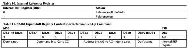 Puesto que no tenemos fácilmente una forma de proporcionar que la tensión de referencia externa, tenemos que decir el chip con la tensión de referencia interna a través de un comando especial. Continuando mirar a través de la hoja de datos, finalmente encontramos en la página 25 (después de ser dirigido allí en la sección de registro interno de referencia en la página 24), en las tablas 10 y 11 la serie de 32 bits que tenemos que enviar configurar el voltaje de referencia interno. Este comando particular se muestra en la fotografía, tomada de la hoja de datos, por encima de.