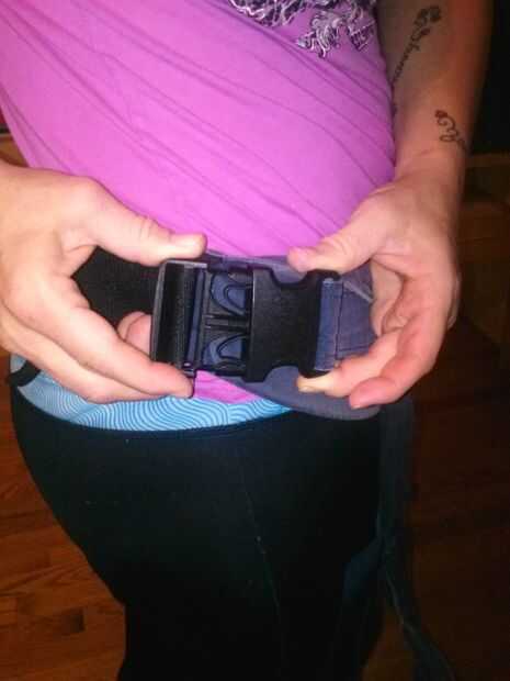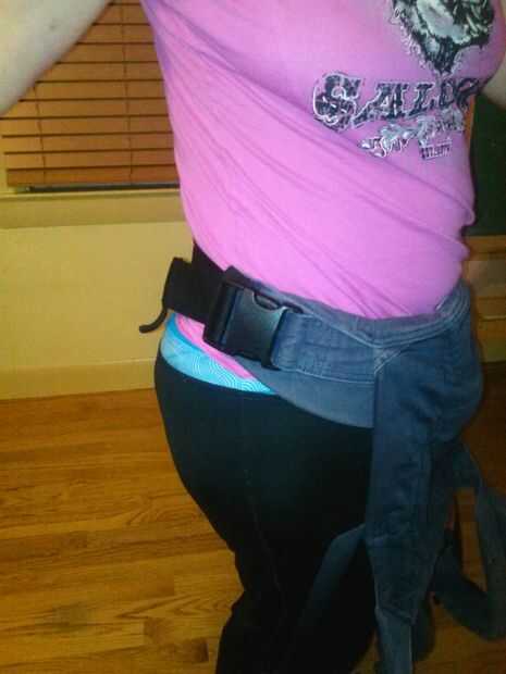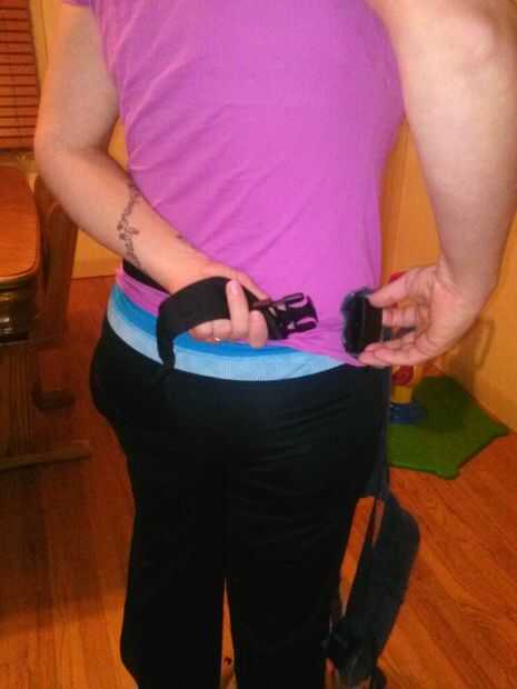 2. para la parte posterior, ponga la etiqueta de advertencia contra su espalda y la Envuelva la pretina a la cintura.