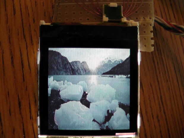 El puerto serie utiliza 115.200 baudios que es muy rápido para un microcontrolador. Esto permite a una rápida transferencia de datos de imagen al microcontrolador y puede dibujar una imagen de 130 x 130 completa en menos de 1 segundo. Para hacer esto, el microcontrolador se debe ejecutar en alrededor de 20MHz (debe ser exactamente 20MHz para utilizar el código sin modificar, pero puede trabajar a 16MHz si se cambia el cálculo de la tasa de baudios). Se utiliza un desplazador de nivel de MAX232 para convertir la señal RS-232 en una señal TTL de 0-5V. Aunque el ATMega168 corre sólo a 3,3 v, las entradas son 5V tolerante así que usted puede conectar la señal de 5V al pin Rx y que todavía funciona.