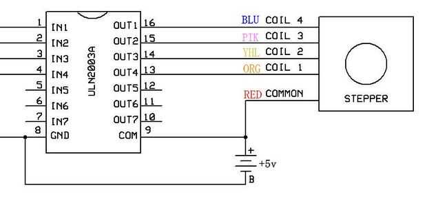 Por ejemplo, desea que su primera salida conectada a la bobina de primera, segunda salida para la segunda bobina y así sucesivamente. Lo que no desea tener es los cables todo mezclados para arriba con la primera salida conectada a la bobina de tercera, la segunda salida conectada a la segunda bobina, la tercer salida conectada a la bobina 4 y la última salida conectada a la primera bobina. Si no sabes cual cable va a que la bobina y poner todas las salidas en una fila no parece estar funcionando, buscar un diagrama de la hoja de datos demostrando que uno es que, mucho como el diagrama que encontrado para el motor paso a paso de 28BYJ48A.