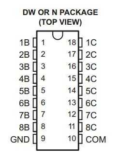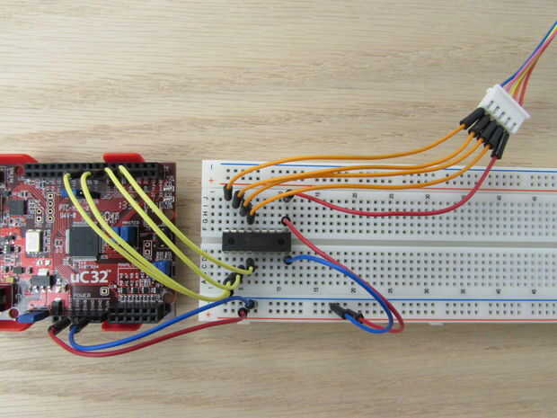 Cuatro de los pines digitales números (letras) en el uC32 conectar a cuatro de las entradas de la matriz de transistores Darlington. Usé los pines digitales 34, 32, 30 y 28 en el uC32 y entradas 1B, 2B, 3B y 4B en la matriz de transistores Darlington, respectivamente.