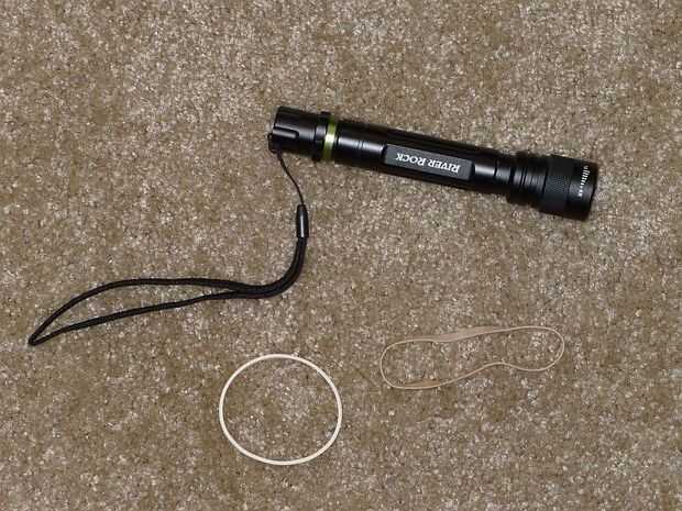 Las otras cosas que necesitas son una linterna que esta cosa va a estar en su cabeza, un pequeño uno es mejor. Usé una linterna "River Rock" que compré en target por $20. Utiliza dos pilas AA, es resistente a la intemperie y muy brillante. Un par de pilas alcalinas dará salida completa para 4-5 horas. Recargable NiMH proporcionará salida completa para 2-3 horas. Eso es un montón de más trayectos de bicicleta en la oscuridad.