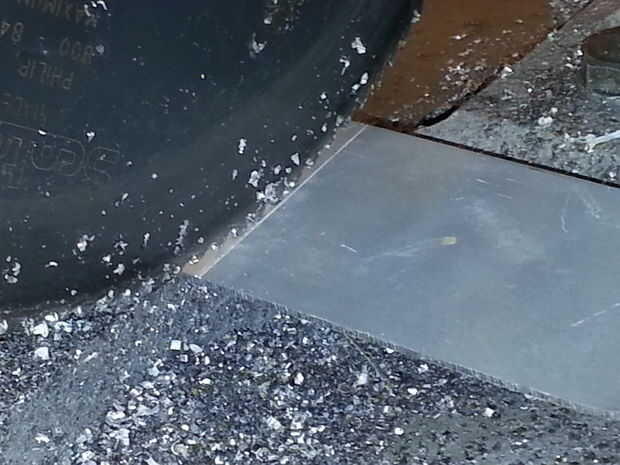 hoja de sierra hasta la marca de puntuación de mover y ajustar piezas según sea necesario (Alinee la hoja con la marca)