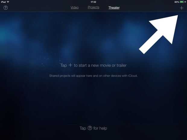 cuando vayas a la app de iMovie, aparecerá una pantalla azul. En la esquina superior derecha, hay un complemento o un signo más. Haga clic en este