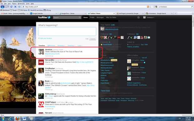 Aviso que #blackhistorymonth se volvió azul. Ahora es un hipervínculo. Si hace clic en él, verás una secuencia de lo que todo el mundo en twitter está diciendo sobre el mes de historia negra. Observe también que en las tendencias sección #blackhistorymonth es tendencia en todo el mundo.