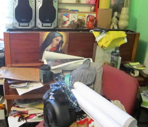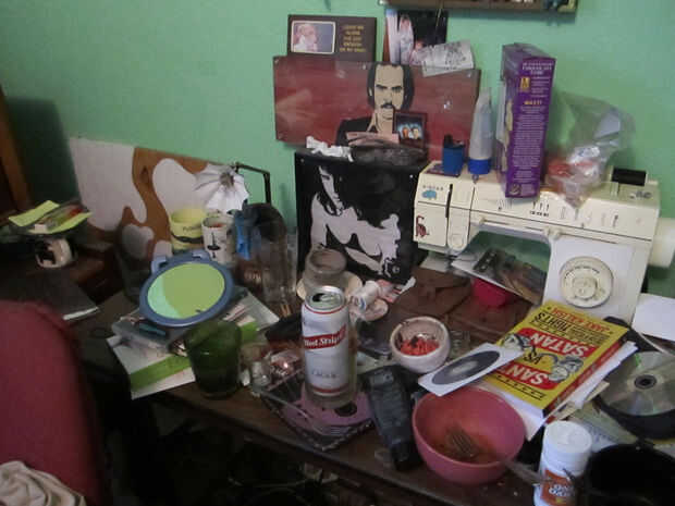 Ahora veamos que "trabajo" mesa cubierta de platos sucios, comestibles junto a sustancias tóxicas, acariciado DVDs tendido boca arriba, cartas de su madre, recibos de cosas que no ha comprado.