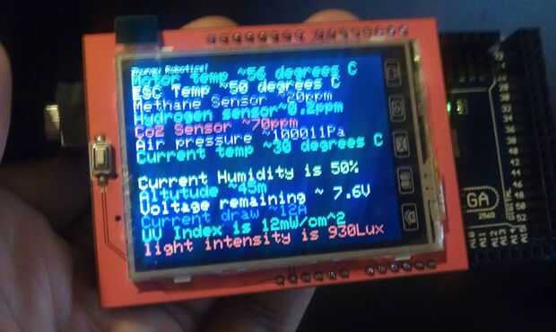 TFT.println ("corriente ~ 12A"); tft.setTextColor(GREEN); TFT.println ("el índice UV es 12/cm ^ 2"); tft.setTextColor(RED); TFT.println ("intensidad de la luz es 930 Lux");