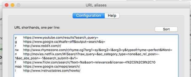En la ficha Configuración, escriba el código de taquigrafía (una sola letra, acrónimo o palabra corta como "mapa" es el mejor) y luego presione Tab. Luego escribes la URL que busca una consulta. Puedes ver algunos ejemplos que utilizo. No dude en copiarlos. Algunos de los enlaces son demasiado largos para post, así que consulte la imagen.