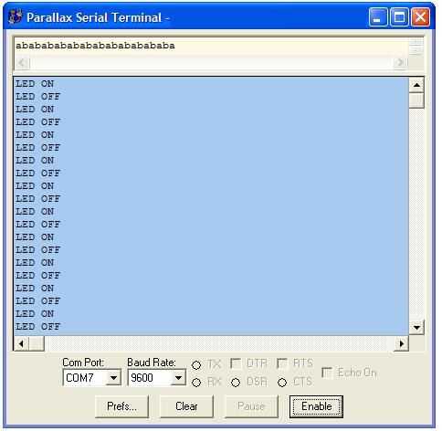 Abrir Terminal Serial Parallax una vez más, conectarse a la misma tasa de puerto y baudios de COM como antes.