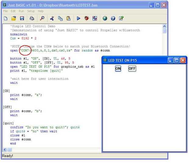 Ajustar el COM7 en línea 7 para que coincida con la configuración de Bluetooth. Presionando los botones de ON/OFF enviará las claves, uny b a la hélice.