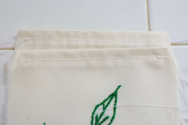 Utilizando un hilo de rosca de perno de seguridad cordón a través del dobladillo superior va todo el camino alrededor de la bolsa dejando la cuerda larga. Un segundo hilo y el hilo por el borde superior del bolso, esta vez pasan por el dobladillo en el extremo opuesto. Dejar un cable largo.