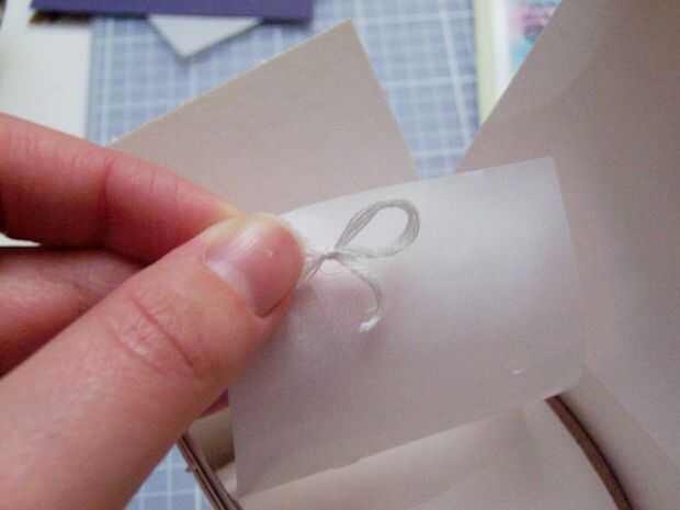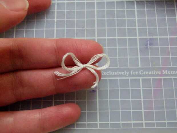Ate un lazo con varios filamentos de seda del bordado. Si lo desea, un filamento adicional de hilo a través del orificio en el encanto del lazo y atarla alrededor del centro del arco.