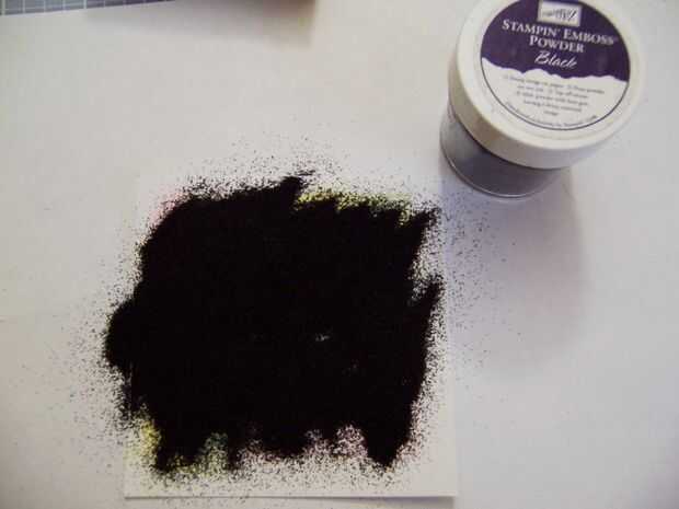 Colocar el sello en una hoja de papel de desecho. Mientras que la tinta está todavía húmeda, cubrir toda la pieza con polvo de grabación en relieve.